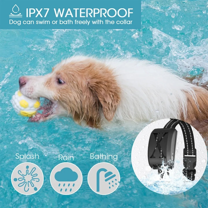 IPX7 vízálló nyakörv – esőben, nedves fűben vagy játék közben is biztonságosan használható.