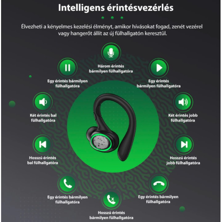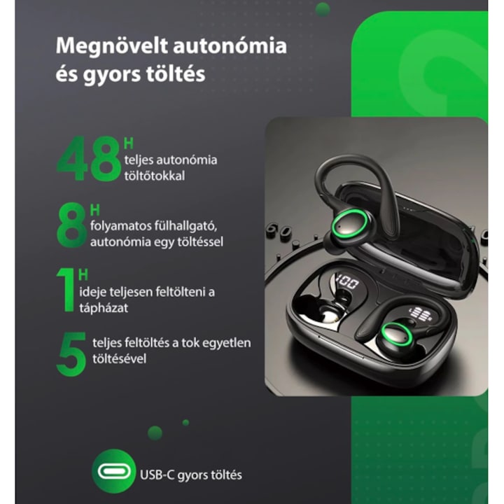 AOVO I25 Vezeték nélküli sport fejhallgató, Bluetooth 5.1, többpontos, zajszűrés, érintésvezérlés, levehető kampók, LED kijelző, HD mikrofonok, IPX7 vízálló, fekete