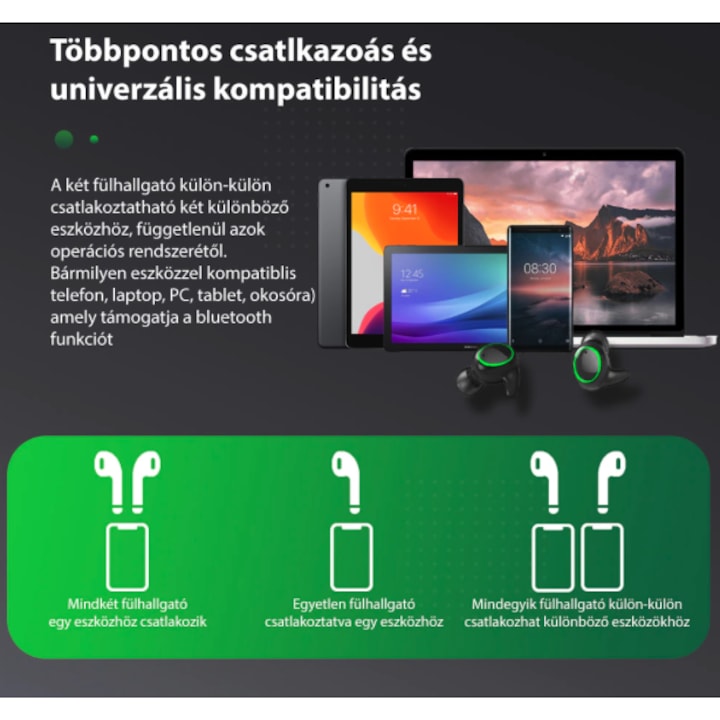 Az AOVO i25 fülhallgató többpontos kapcsolódási lehetőséggel rendelkezik, így akár két eszközt is egyidejűleg csatlakoztathatsz. Használhatod Android, iOS vagy Windows operációs rendszerrel is, így nincs korlát a kompatibilitás terén.