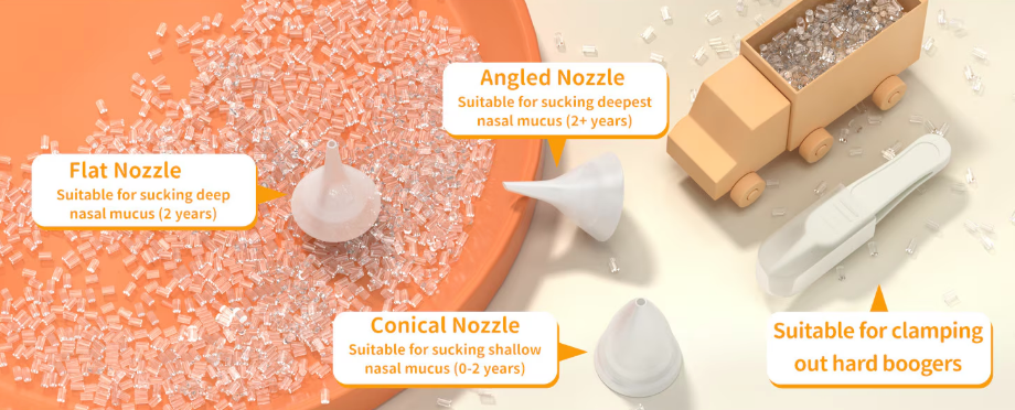 3 Cserélhető Szilikon Fej: Különböző méretű és formájú fejek biztosítják, hogy újszülött kortól egészen kisgyermek korig tökéletesen illeszkedjen az orrjáratokhoz. A fejek puha, BPA-mentes szilikonból készültek.